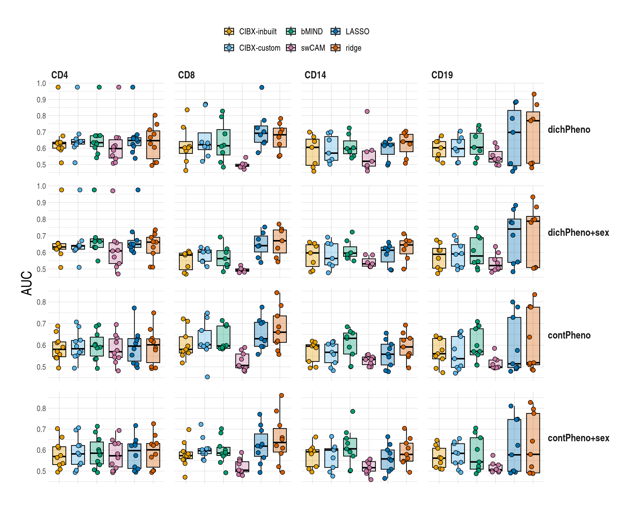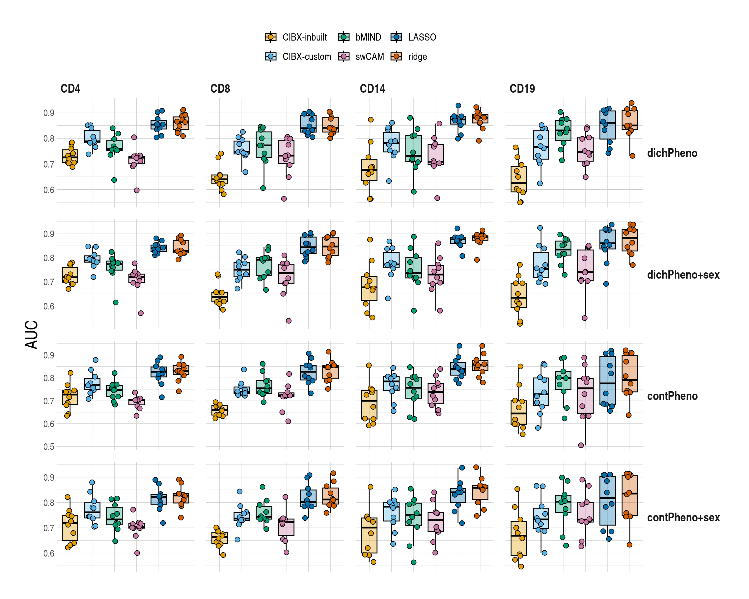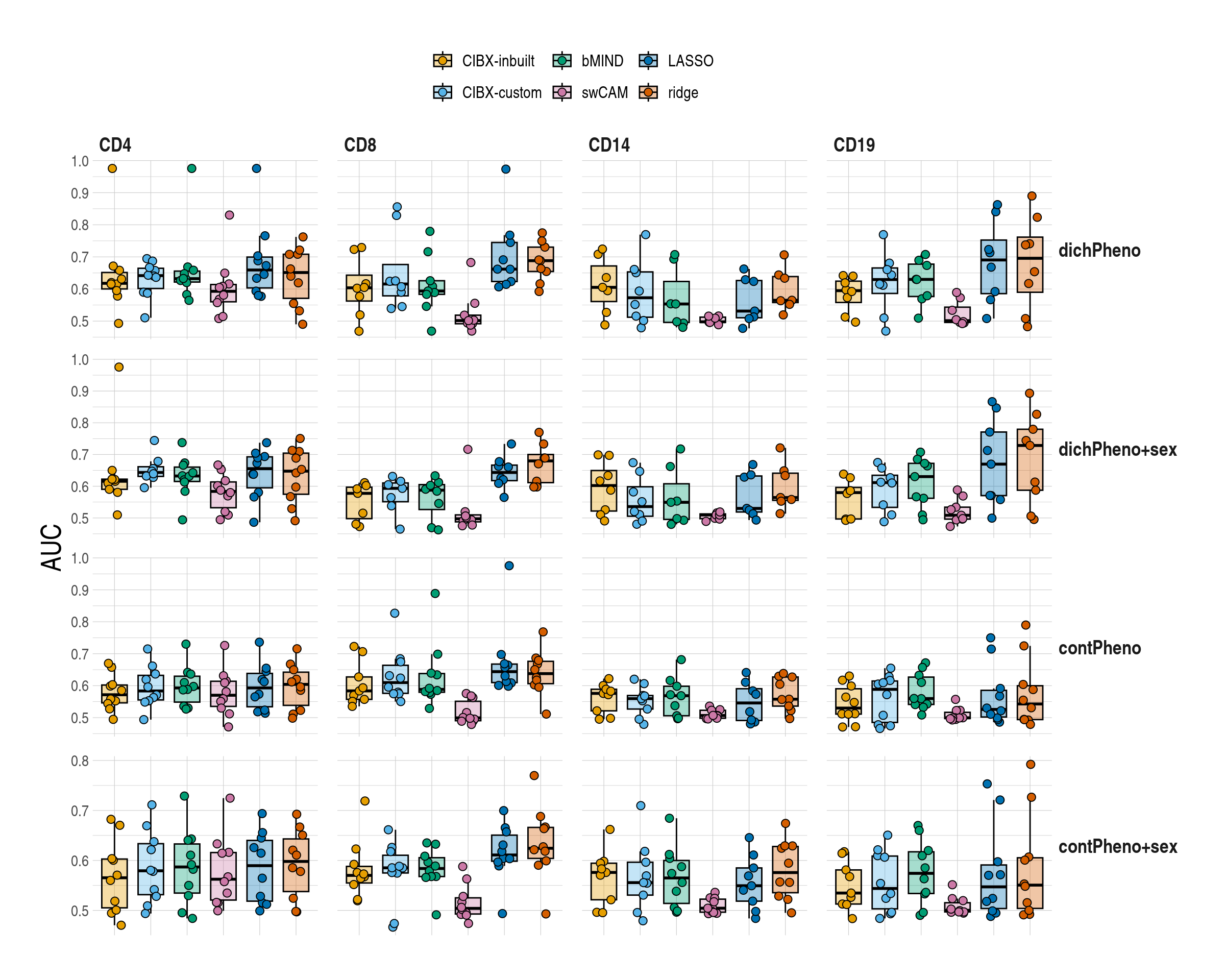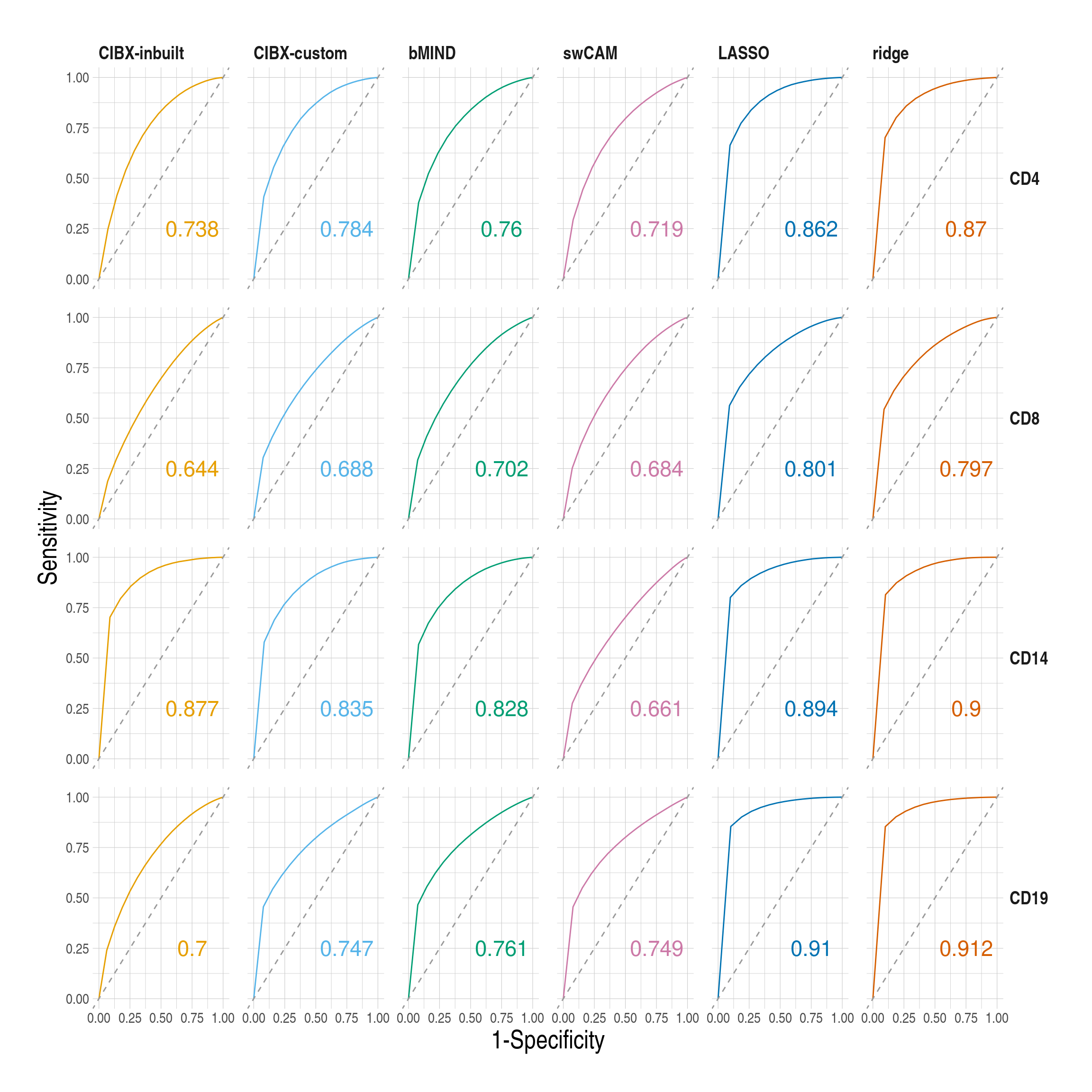 | CD4 | 0.63 (0.62-0.65) | 0.64 (0.62-0.64) | 0.67 (0.63-0.68) | 0.61 (0.53-0.66) | 0.65 (0.63-0.67) | 0.66 (0.59-0.69) |