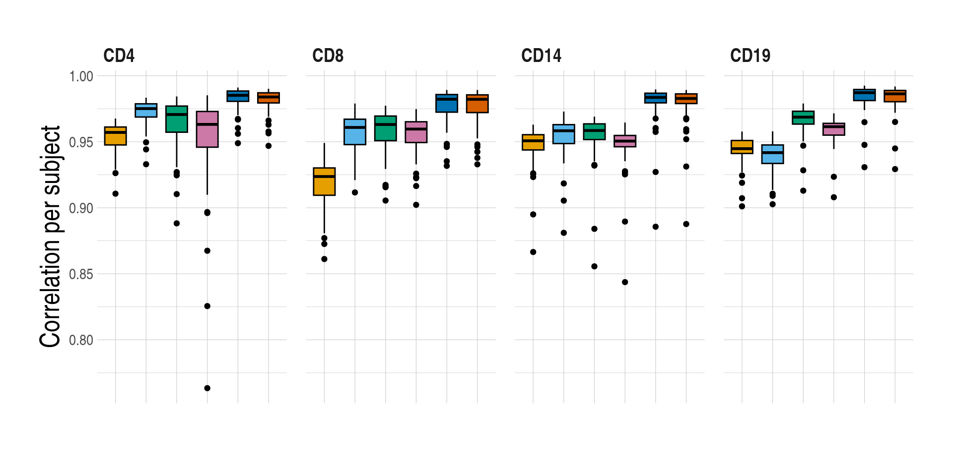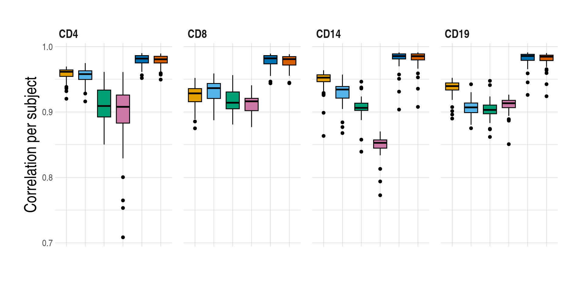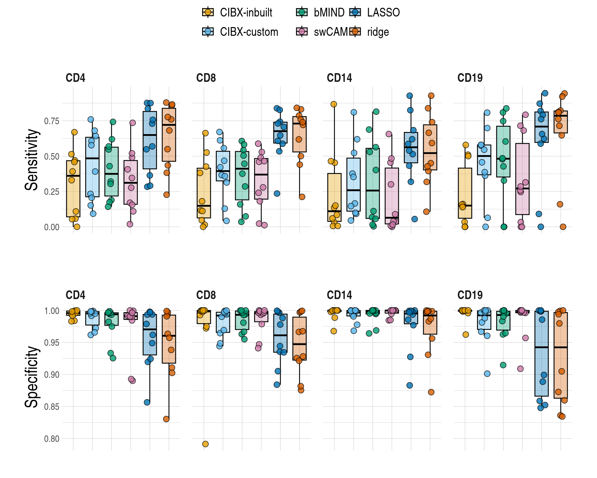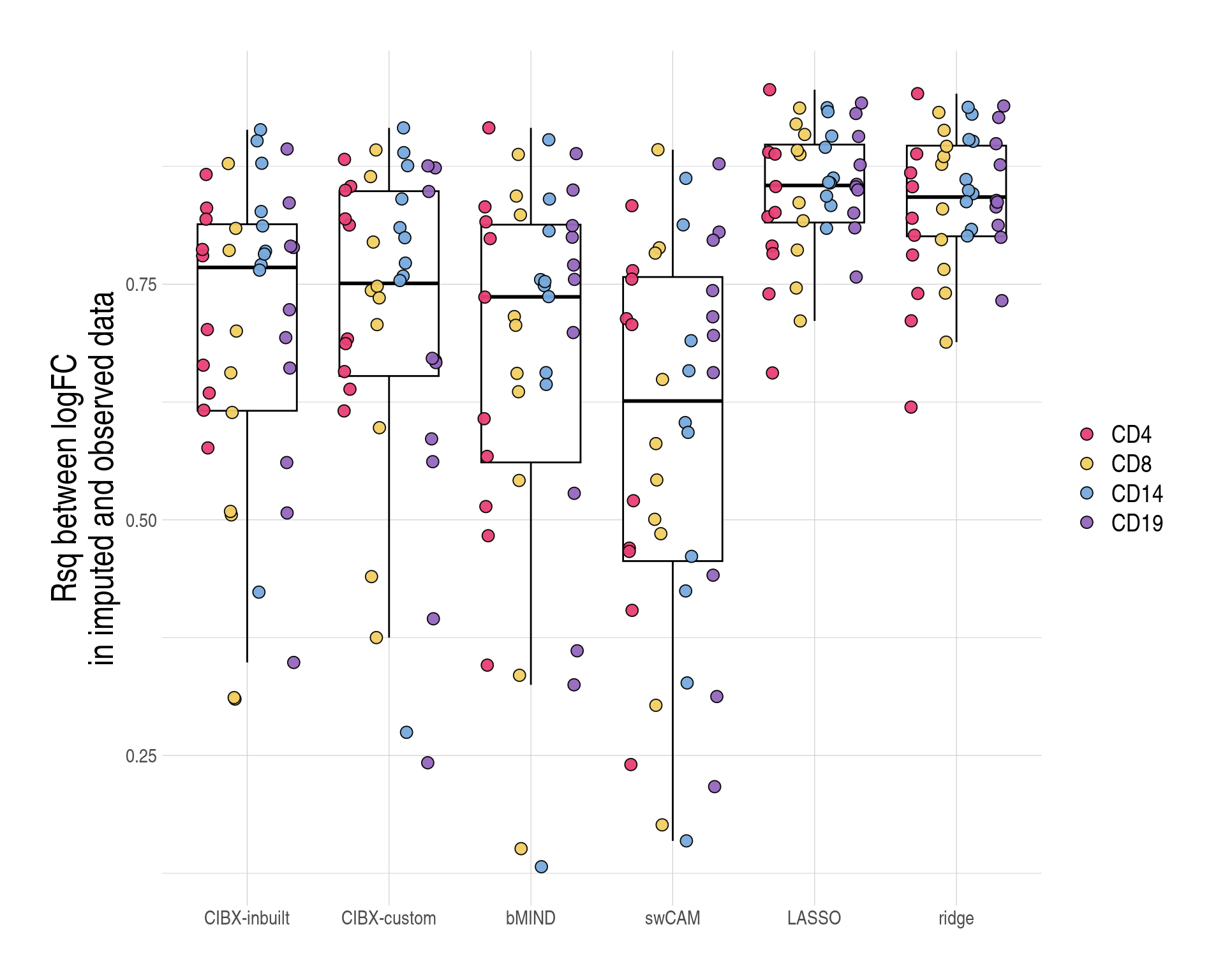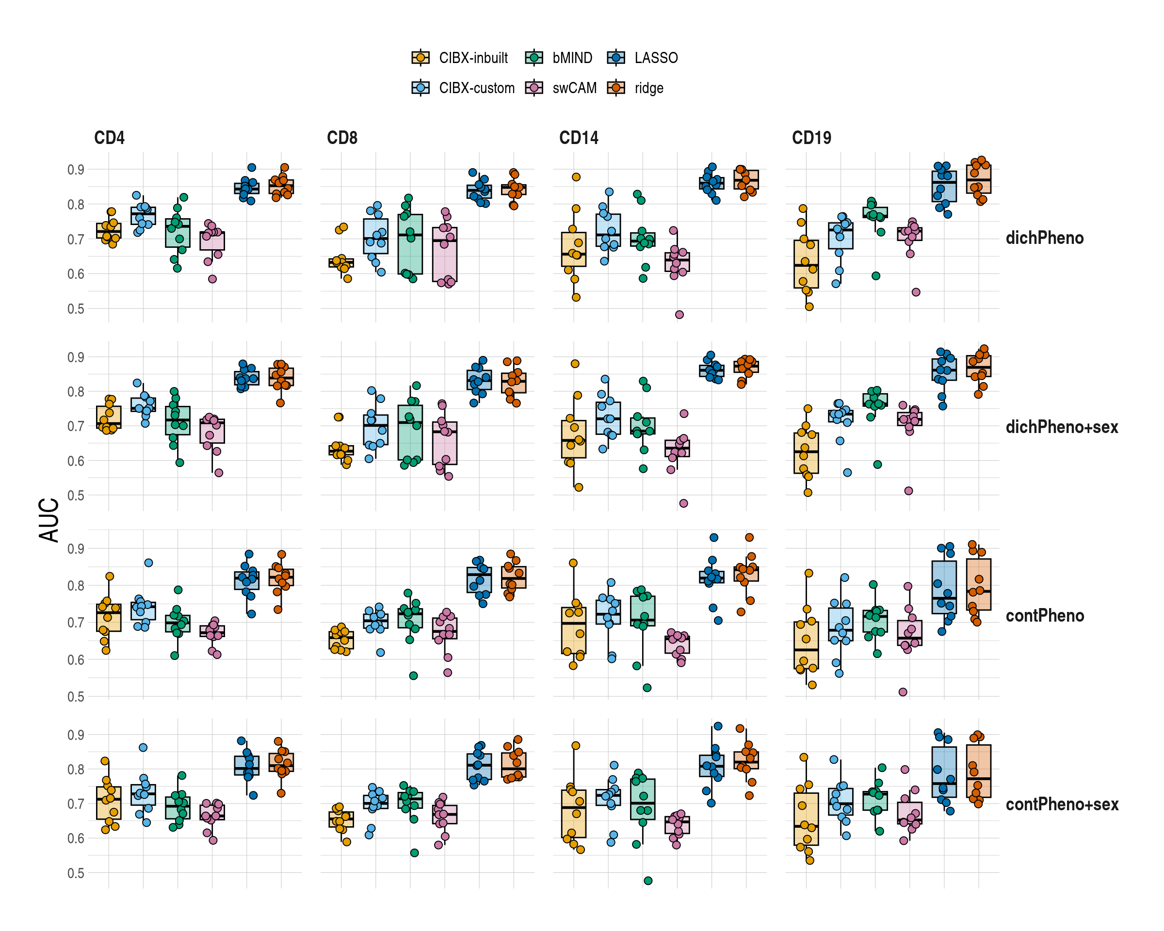 | CD4 | 0.63 (0.62-0.65) | 0.64 (0.62-0.64) | 0.67 (0.63-0.68) | 0.61 (0.53-0.66) | 0.65 (0.63-0.67) | 0.66 (0.59-0.69) |
