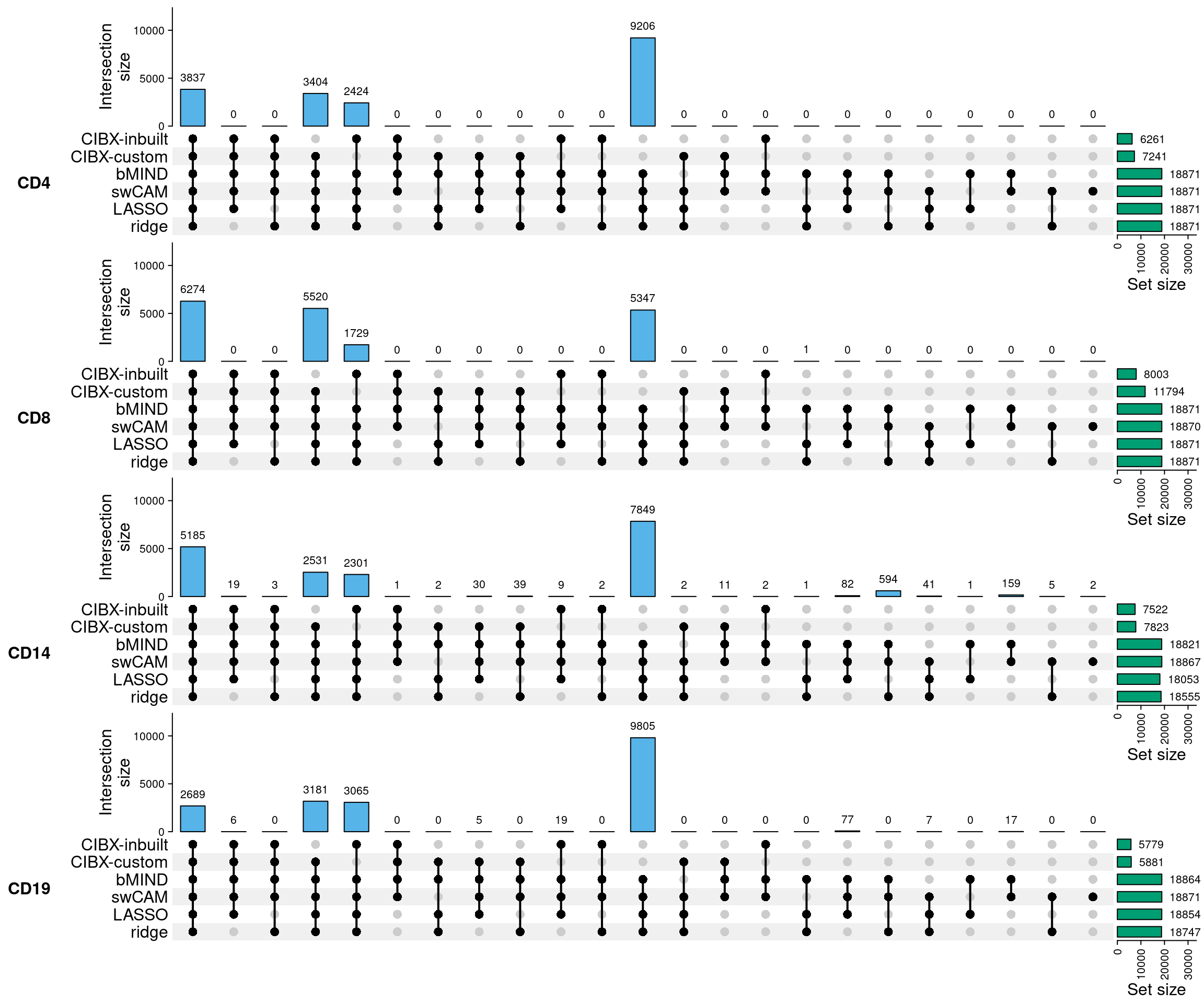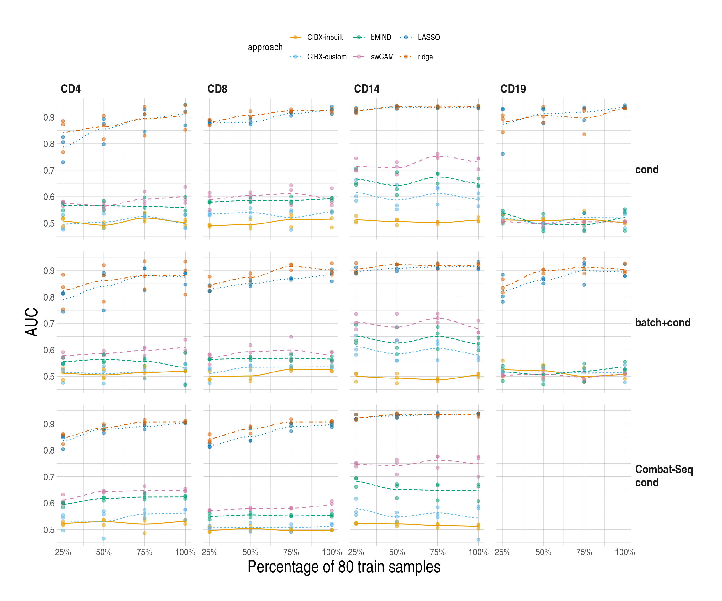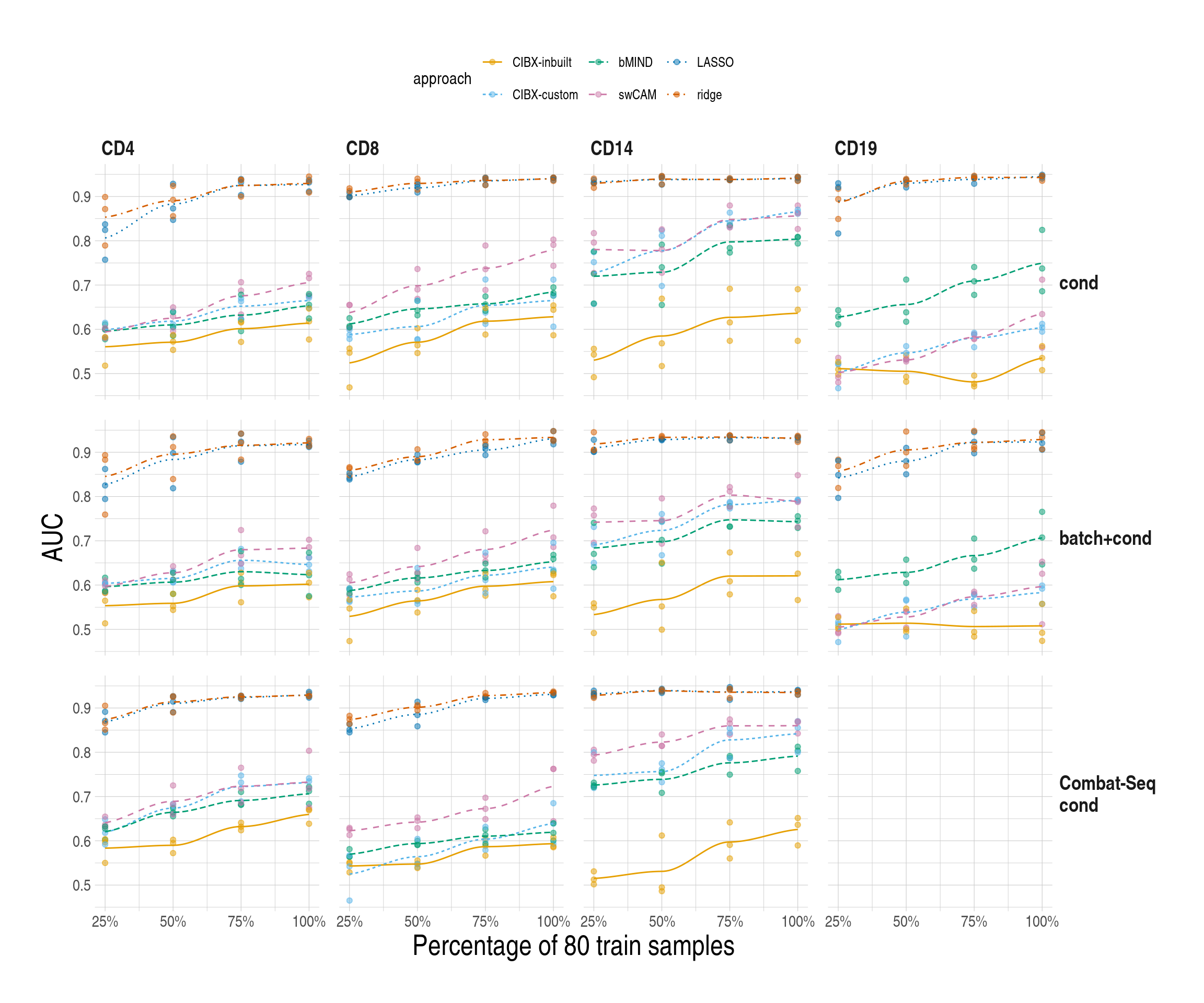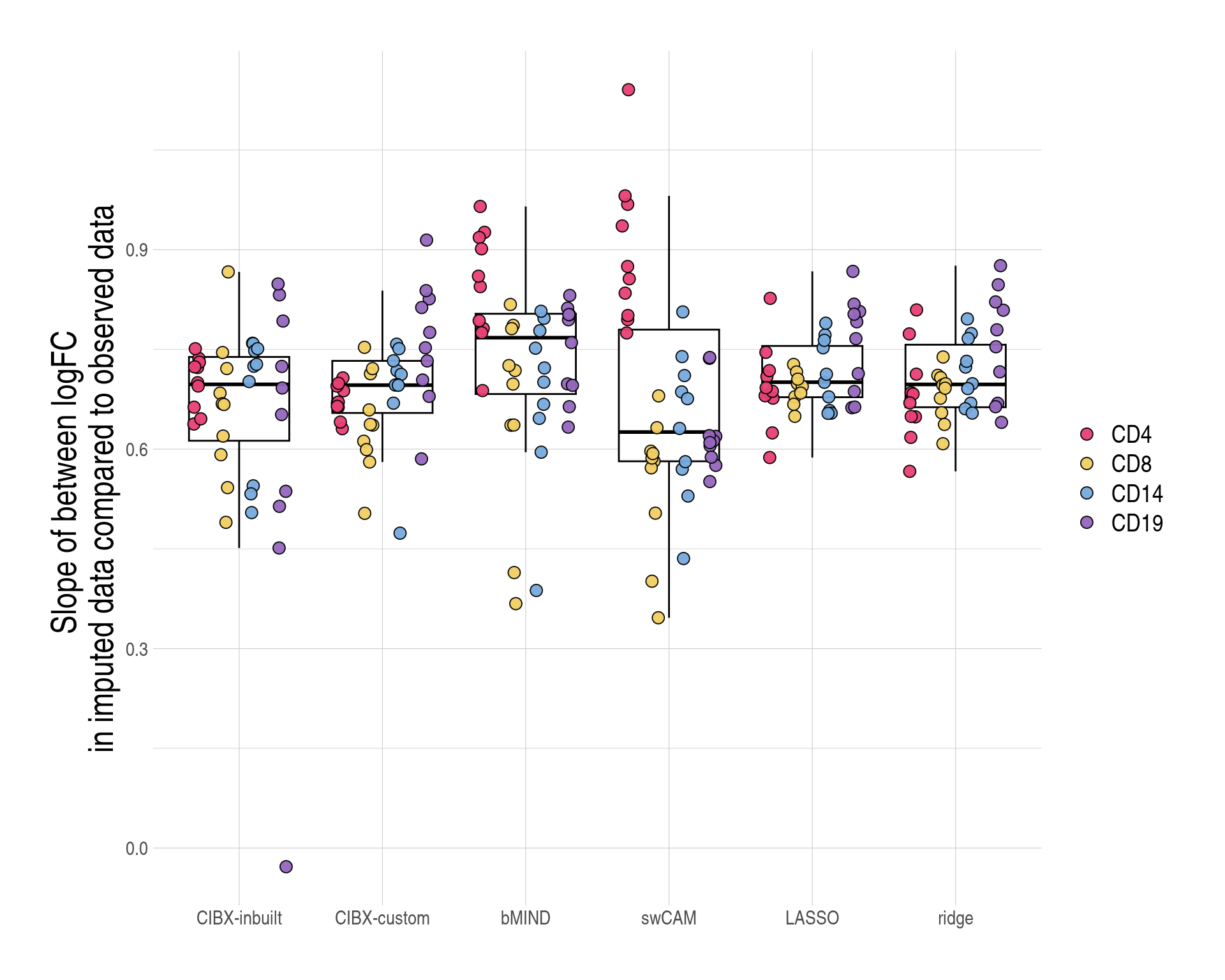 - Data analysis workflow. Transcripts per million (TPM) were calculated after excluding low-expressed genes. TPM from sorted cells (CD4, CD8, CD14, and CD19) from 80 training samples were used to generate custom signature genes using the CIBERSORTxFractions module. We deconvoluted the cell fractions from PBMC based on inbuilt and custom signatures using CIBERSORTx, using the custom signature genes with bMIND and cell-type specific genes using debCAM. Estimates of cell fractions were compared to the ground-truth cell fractions from flow cytometry, and we assessed fraction accuracy using Pearson correlation and RMSE (root mean square error). Next, we estimated sample-level cell-type gene expression based on inbuilt and custom signature matrices using the CIBERSORTx high resolution module. In parallel, we ran bMIND and swCAM, with the flow cytometry cell fractions, in a supervised mode for estimating cell-type expression. For each cell type, we trained a LASSO/RIDGE model on PBMC and sorted cells with 5-fold cross-validation and used this to predict cell-type gene expression in the test samples. We compared imputed cell-type expressions with the observed ones and evaluated and benchmarked the performance using Pearson correlation, RMSE and a novel measure, differential gene expression (DGE) recovery.