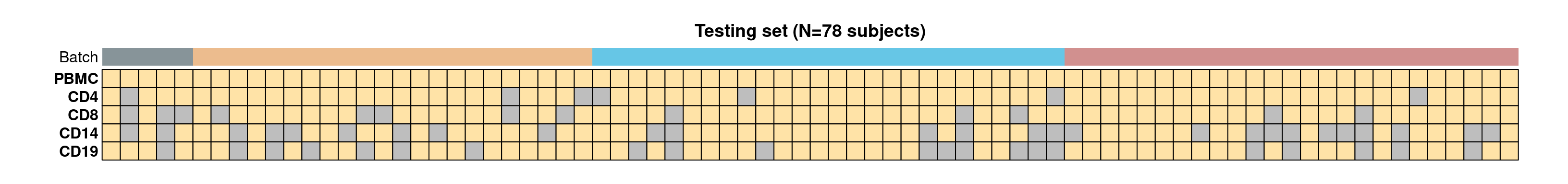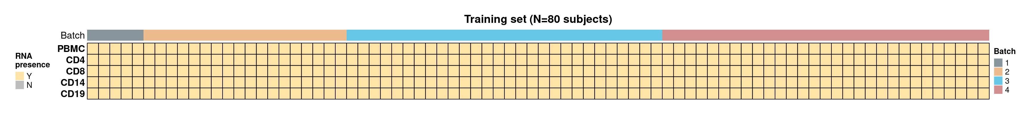 - CLUSTER samples by cell type (row) and subject (column). Cells are coloured based on the availability of RNA (Y for yes, N for no), and the top panel annotations indicate the RNA sequencing batch (Batch).